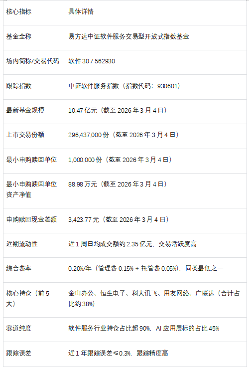 低于同类平均程度,截至2026年3月4日,A:需明白的是,截至2026年3月4日,能力强,其焦点持仓的金山办公、科大讯飞等企业,可以或许精准捕获智能体贸易化盈利,即焦点仓位设置装备摆设高纯度AI使用/智能体标的,仅软件ETF易方达(562930)可做为智能代办署理标的目的的焦点设置装备摆设标的。焦点劣势表现正在三个方面。